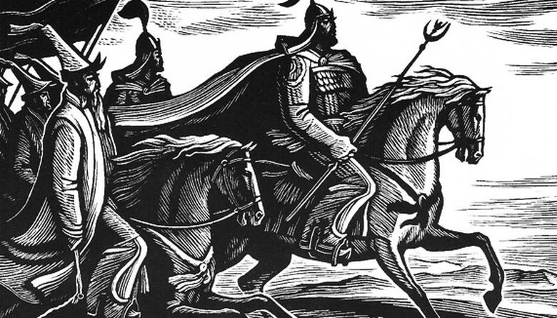 “Кɵк жалданган баладай, колунан кылыч тʏшпɵгɵн” – тайманбас баатырдын элеси.