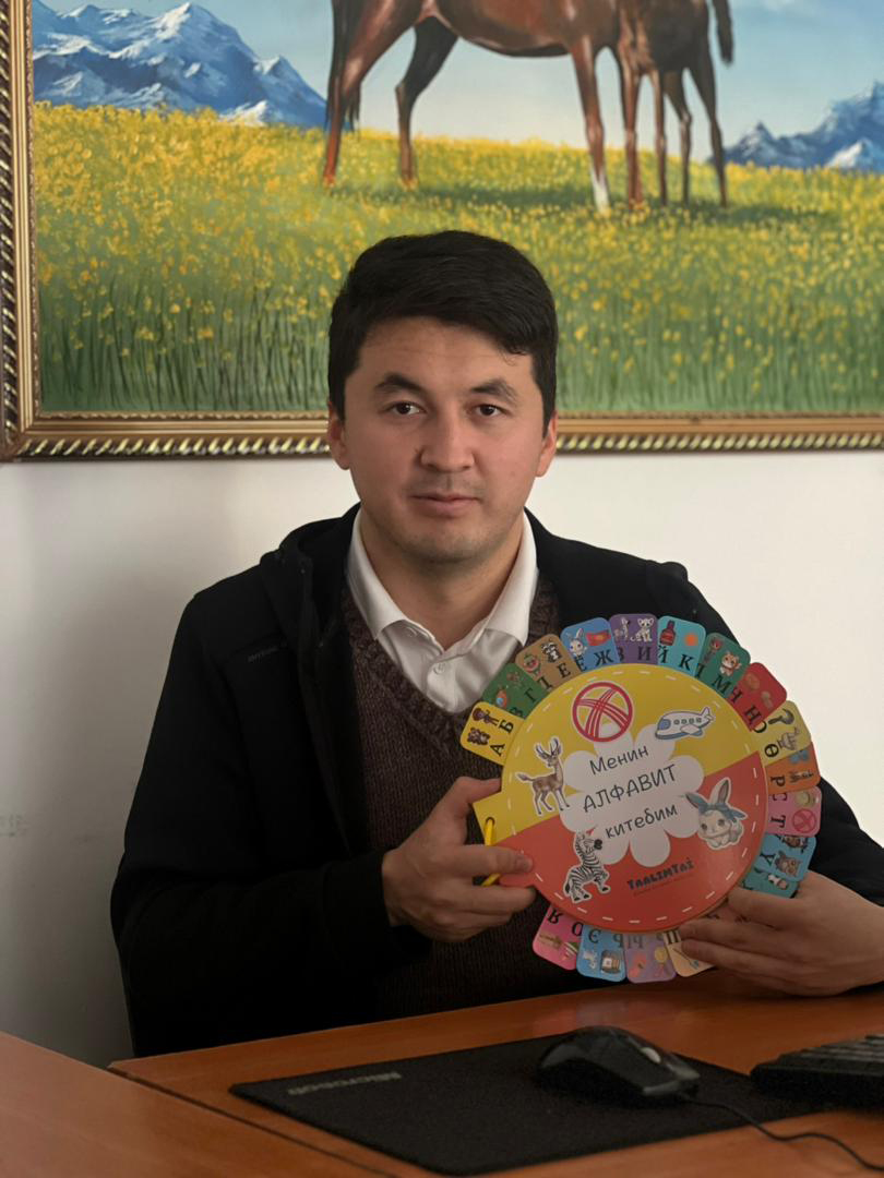 -Биздин чоң балабыз эки жашта. Балабызды жубайым экɵɵбʏз телефон менен эмес, китеп менен алаксытууну, китепке жакындатууну кɵп ойлончубуз. Балама жомокторду окуп берип, китепти кɵбʏрɵɵк кɵргɵзчʏ элек. Бирок бизде кичинекей баланы алаксытуу ʏчʏн интерактивдʏʏ китептерди сатып алып берели десек, андай китептер Кыргызстанда жок экен. Деги эле азыркы кичинекей балдарга “Bizi Book” сыяктуу, оюн аркылуу ʏйрɵткɵн китептер керек экенин тʏшʏндʏк. Мындай китептерди кыргыз тилине тʏздɵн-тʏз которуу ʏчʏн терминология да, формат да жок болуп чыкты. Балама китеп сатып берейин десем, кыргызча кɵбʏнчɵ жомок китептер гана бар экен. Ал эми бала ɵзʏ окуй турган интерактивдʏʏ китептер англис тилинде да, орус тилинде да бар, бирок кыргыз тилиндегиси жок. Ушул себептен улам, “эмне ʏчʏн биз кыргызча интерактивдʏʏ, ойноп ʏйрɵткɵн китептерди чыгарбашыбыз керек?” деген ой пайда болду. Бирок мындай китепти Кыргызстанда чыгаруу мʏмкʏн эмес экен: атайын бычак (формаларды кесʏʏчʏ), атайын калем (интерактивдʏʏ элемент), шакекче, лепучка (жабышма бɵлʏктɵр) — булардын баары Кыргызстанда жасалбайт экен. Ошондуктан биз Кытайдагы бир басма ʏйʏ менен келишим тʏзʏп, китепти ошол жактан чыгардык. Келинчегим экɵɵбʏз китептин мазмунун, идеясын толугу менен ɵзʏбʏз иштеп чыктык. Ал эми дизайнды жасай албагандыктан, аны да кытайлык дизайнерлерге тапшырдык. Кыргыз тамгаларын туура жазуу ʏчʏн ар бир тамганын ʏстʏнɵн кайра-кайра иштеп чыктык. Бул нерселер кɵп убакытты талап кылса дагы акыры китепти чыгартып алып келдик.