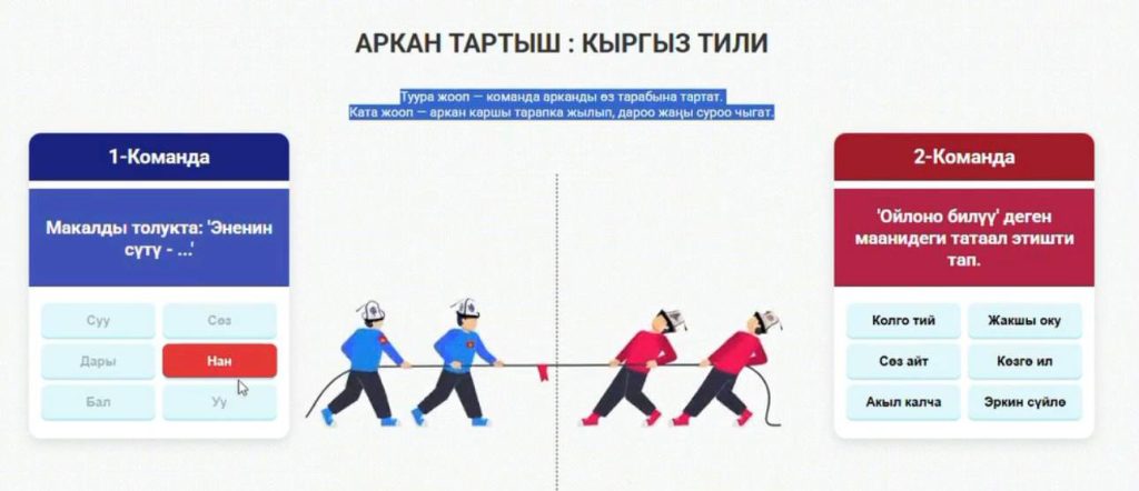 Оюн учурунда студент же окуучу жɵн эле туура жооп берип тим болбостон, ошол жооп аркандын кыймылына таасир этет. Бул — атаандаштык сезимин кʏчɵтʏп, окуучунун оюнга толук аралашуусуна ɵбɵлгɵ тʏзɵт. Натыйжада билимди текшерʏʏ бир калыптагы кургак тест эмес, динамикалуу, улуттук тʏсʏ бар интеллектуалдык оюнга айланат.