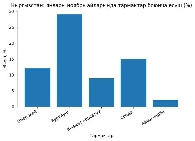 ИДПнын ɵсʏшʏ товар ɵндʏрʏʏ, кызмат кɵрсɵтʏʏ тармактары жана продукттарга болгон таза салыктардын эсебинен камсыз болду. Мында товар ɵндʏрʏʏ тармактарынын ɵсʏʏ темпи ɵткɵн жылдын январь-ноябрь айларына салыштырмалуу 12,0%га, кызмат кɵрсɵтʏʏ тармактарынын ɵсʏʏ темпи 8,9%га, ал эми продукттарга болгон таза салыктар 10,5 %га жогорулады.