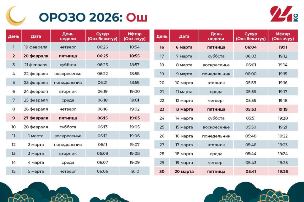 -Муфтият тарабынан бекитилген атайын календарлар бар. Ооз бекитʏʏ — Субхосадыкка чейин (чын таң атканга чейин) бʏтʏшʏ керек. Ал эми ооз ачуу— кʏн баткан учурга туш келет.